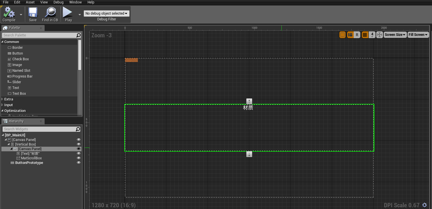 注意 ScrollBox 重命名为 “MatScrollBox”,Button 命名为 “ButtonPrototype”,这个名字可以用于代码中寻找这两个 UI 的引用,所以很重要。