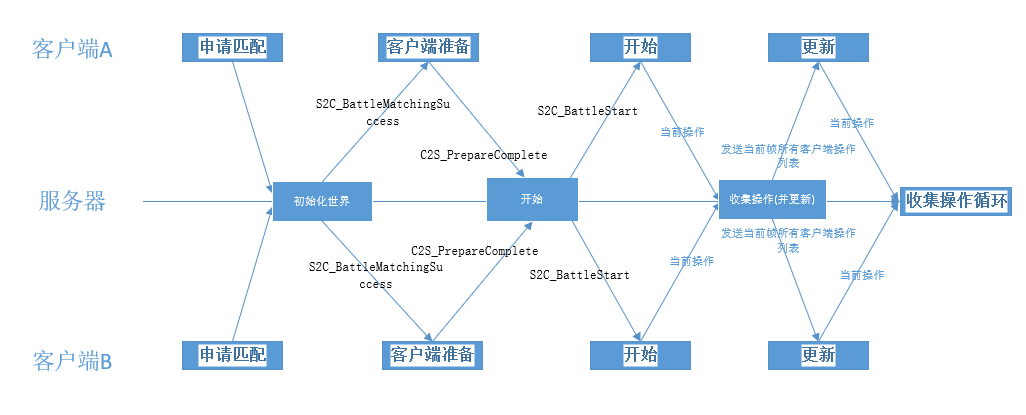 - 服务器接收到客户端操作,若所有客户端操作都已接收到,则将操作列表同步给所有客户端,并更新服务器存在的『世界』(该世界可以用于最终结果的验证)