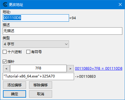 其模块名为 Tutorial-x86_64.exe,基础偏移为 325A70,后续偏移一次为 7F8