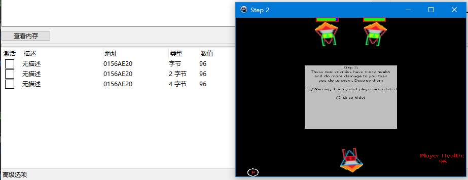 还是以 CE 的示例为例吧,打开 CE 的教程游戏,第二关,此处以血量为例,首先查找当前血量地址: