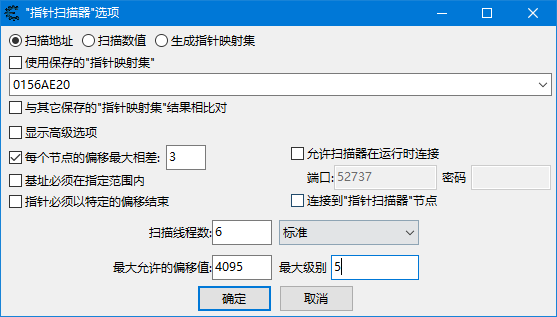 最大级别,一般 5 级或以下就行了,通常一个地址指针不至于偏 6 级以上,当然最后实在找不到可以尝试高级别的设置,因为级别越高,需要搜素的数据量和产生的结果也越多。