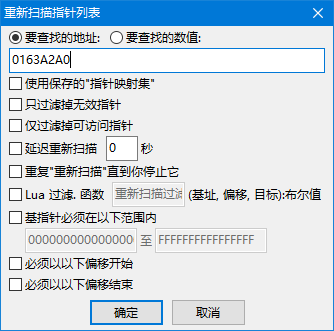 随便扫描一个数值 -> 右键地址 -> 反汇编此内存区域 -> 工具 -> 指针扫描器 -> 文件 -> 打开 -> 选择保存文件