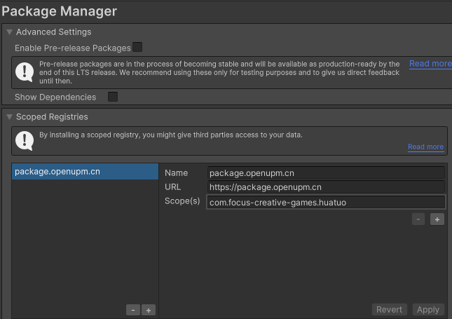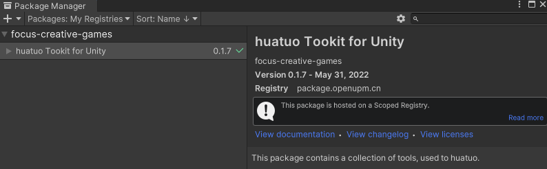 - 打开 Edit->Project Settings->Package Manager 界面,切换到 Window->Package Manager->Packages: My Registries 中将看到名为 huatuo Tookit for Unity 的包,直接安装即可。