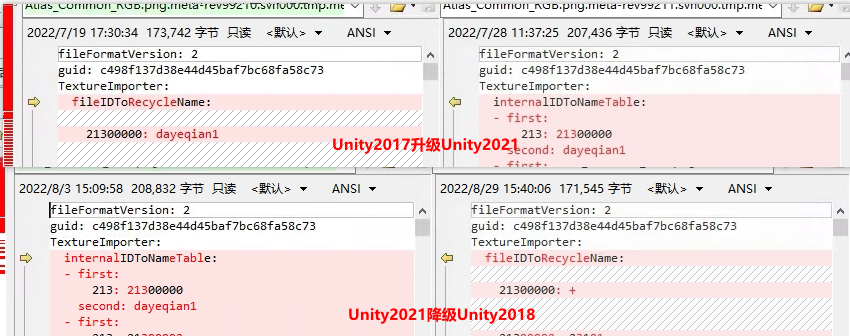 这个救不了,看修改记录引用 GUID 都有变化,而且降级之后 Unity 完全不会处理这一块,已被自动升级修改的也不会再自动改回去,Missing 了也不见怪,只能还原到升级之前。