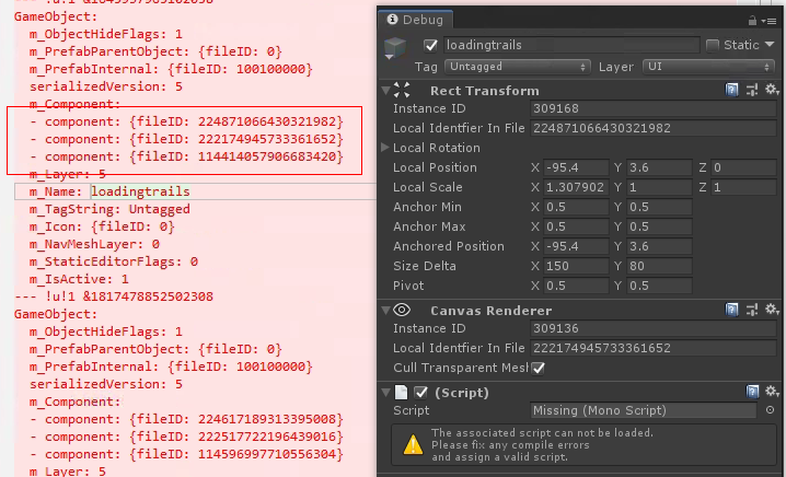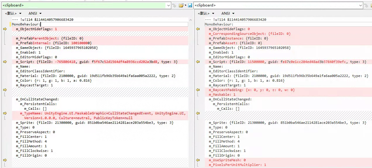 可以注意到,此处虽然高版本多了点东西、少了点啥,其实这些影响都不大,但是最关键的是 m_Scripts 字段 fileID、guid 全变了!