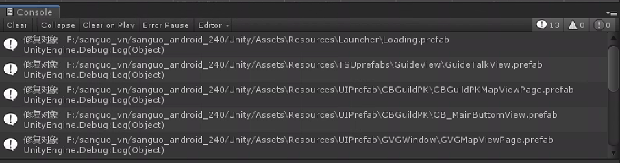 Debug.Log($"修复对象:{prefabLists[i]}"); | |