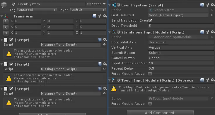 - 场景 Unity 组件丢失,例如挂载的 UGUI 相关 StandaloneInputModle、EventSystem