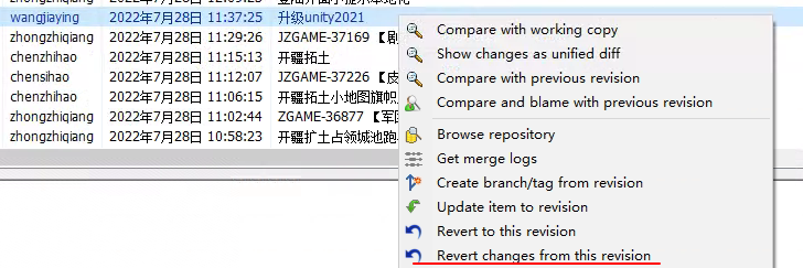 在 SVN 上找到上次的提交记录,选择 『Revert changes from this version』,表示还原所有自此次提交的修改: