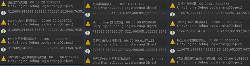 UnityEngine.Debug.LogWarning(string.Format("带回调自定义函数拼接数组:{0}", stopwatch.Elapsed.ToString())); | |
