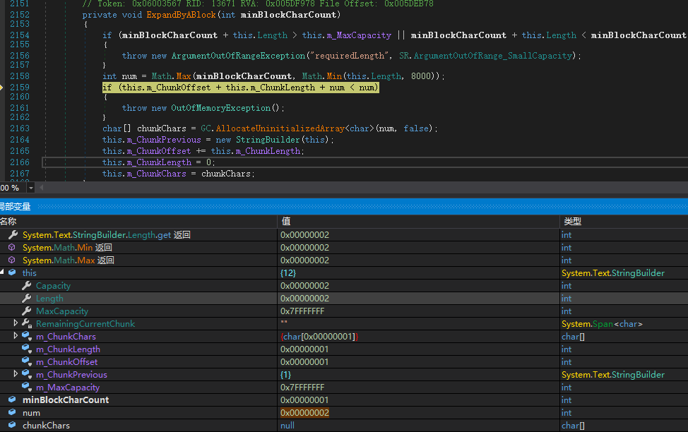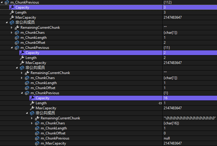 (注:只有在扩容的时候才是如此,否则 Capacity [this.m_ChunkChars.Length + this.m_ChunkOffset] 才是就算没装满的所有节点的总容量)