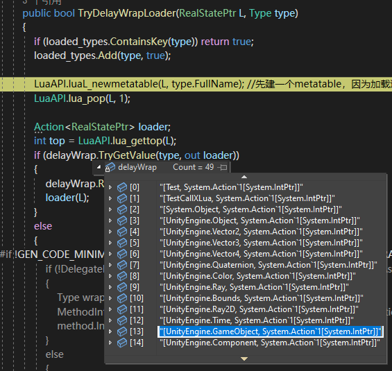 然后进入 TryDelayWrapLoader ,因为之前我生成过代码,所以 delayWrap ,即之前提到过的生成代码注册的列表存在对应类型: