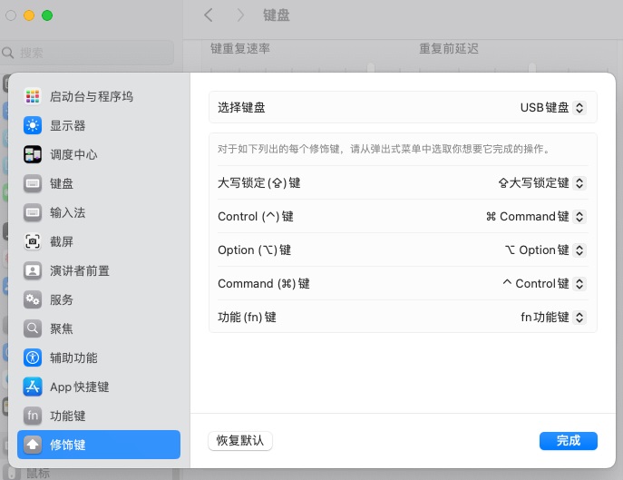 - 设置 -> 键盘 -> 键盘快捷键 -> 修饰键: