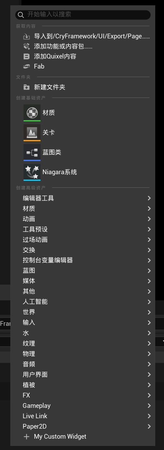 以上就是我自己发现的几种扩展编辑器资源创建菜单的方法,虽然第四种仅适用于 UserWidget 蓝图,不过如果其它类型的蓝图系统本身带了类似的创建界面,应该都可以找找有没有差不多的扩展方式 —— 实在不行,貌似貌似还可以直接实现一个这种界面,不过那就走远了。